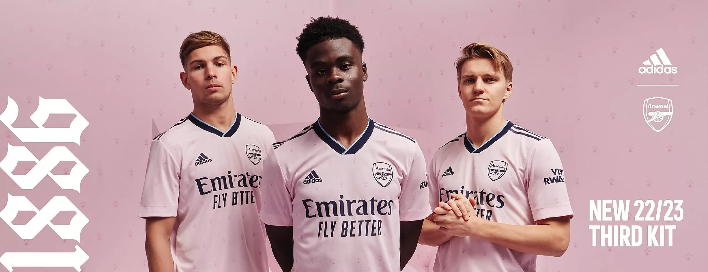 - The Arsenal FC 2022/2023 third football kit is mainly a light shade of pink. It is the first-ever pink shirt in the history of the North London club.